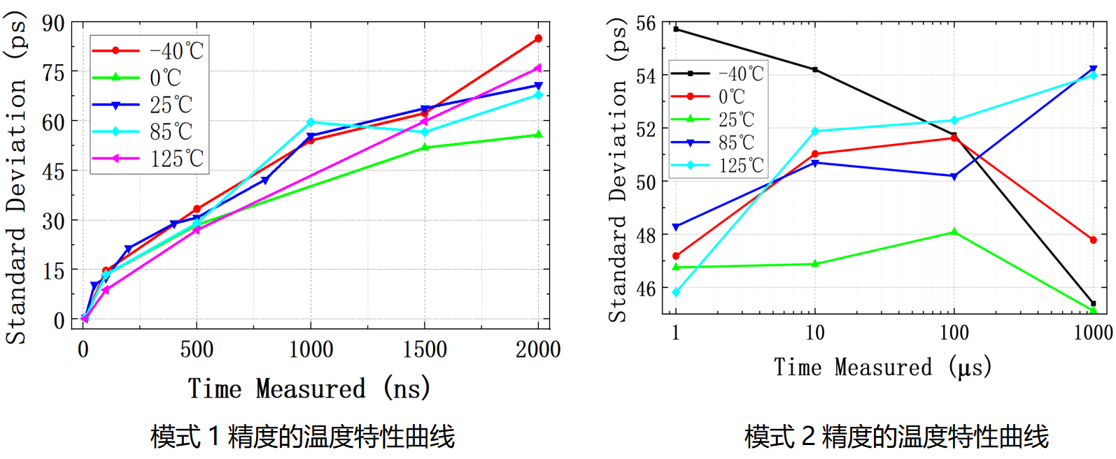 测距设备应用环境较为复杂,需要在各种环境温度下工作,要求TDC拥有较高的环境鲁棒性。如下图所示,TMIS7701/7702在−40℃~125℃范围内,500ns的飞行时间,测量结果值从最低温到最高温仅偏移了0.6ns,在同类产品中处于较低水平,而且良好的温漂一致性可以很方便地进行温度补偿。通过采用指定的温漂系数进行补偿,TMIS7701/7702产品在−40℃~125℃范围内的测量误差不超过±60ps (3sigma,99.74%置信概率)。